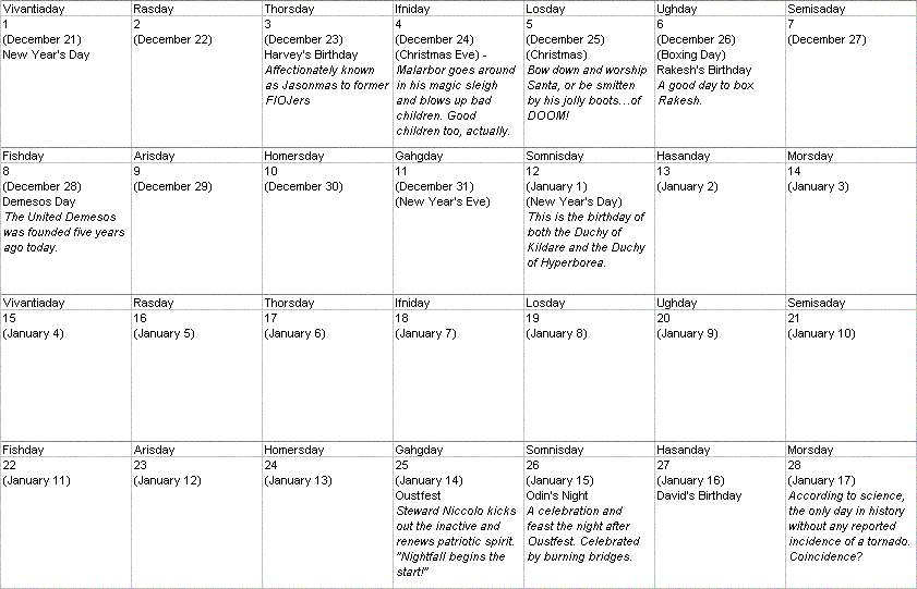 Why is the coldest, deadest month of the year named after the goddess of life? Does it symbolize how, even in the most barren times, the seeds of life exist just waiting to blossom? Or does it symbolize that we really shouldn't expect the Shirerithian calendar to make sense, considering its origins? Viviantiana begins on a high note with Christmas, and ends on a high note with the Oustfest, one of Shireroth's least observed but most important holidays.