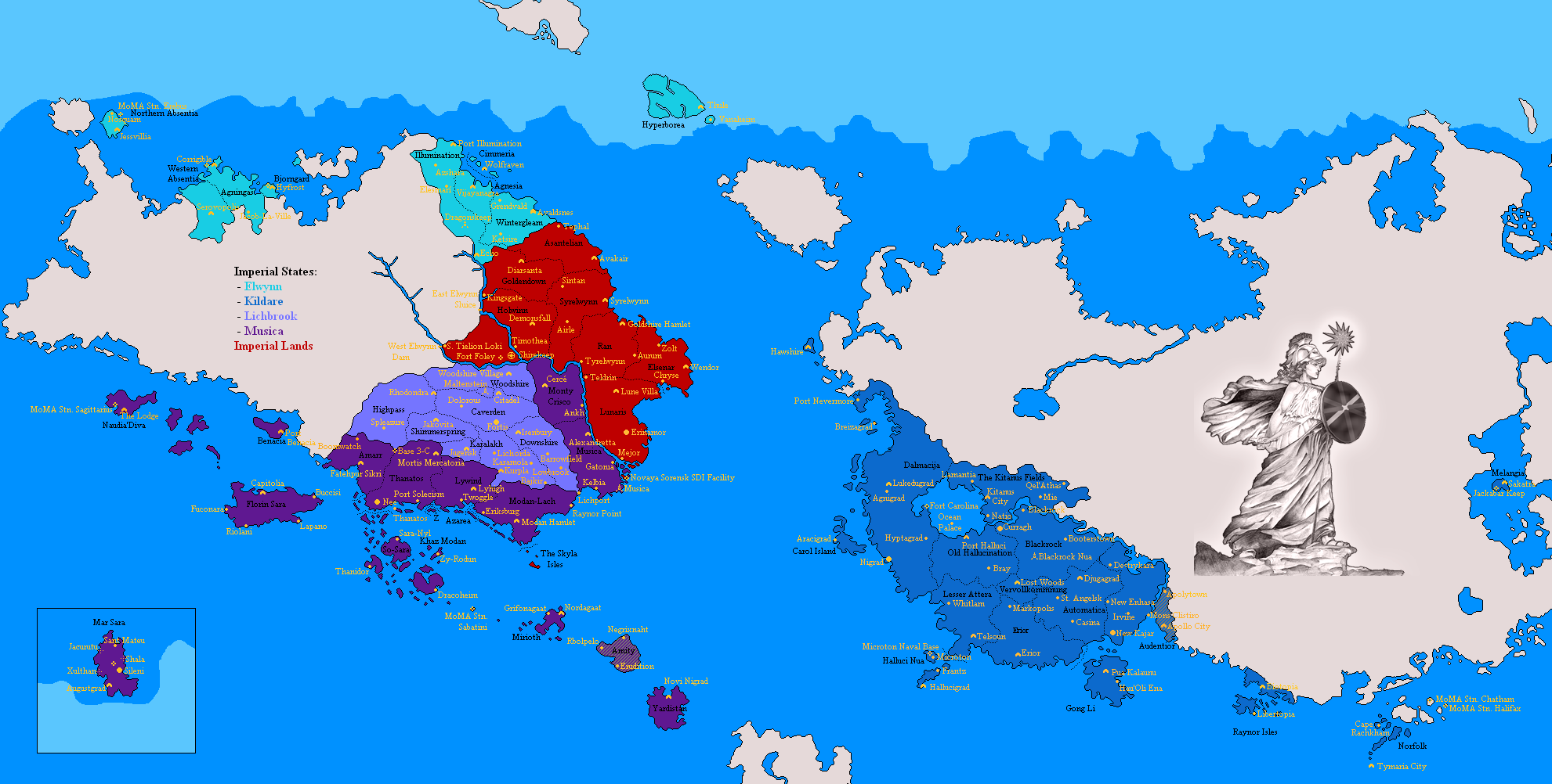 Most citizens of Shireroth reside in an Imperial State. If you choose to immigrate, you will be expected either to choose an Imperial State of Imperial Dominion or give the Minister of Immigration and Naturalization permission to choose one for you. The current Imperial States are as follows: